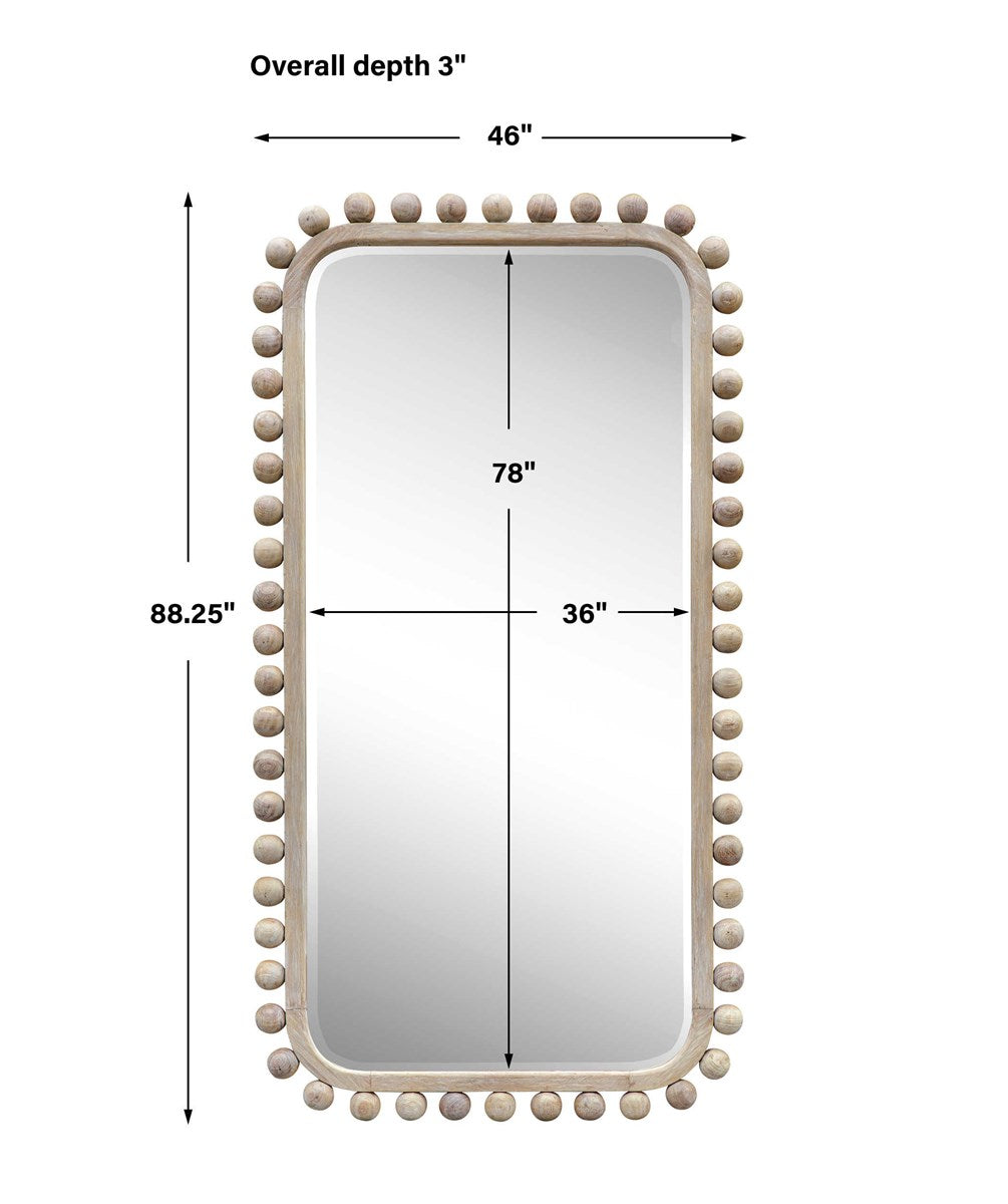 Hand-brushed, solid wood spheres line the outer edge of a wooden frame, all in a natural finish. Mirror features a generous 1 1/2" bevel. May be hung horizontal or vertical. Also available in black.