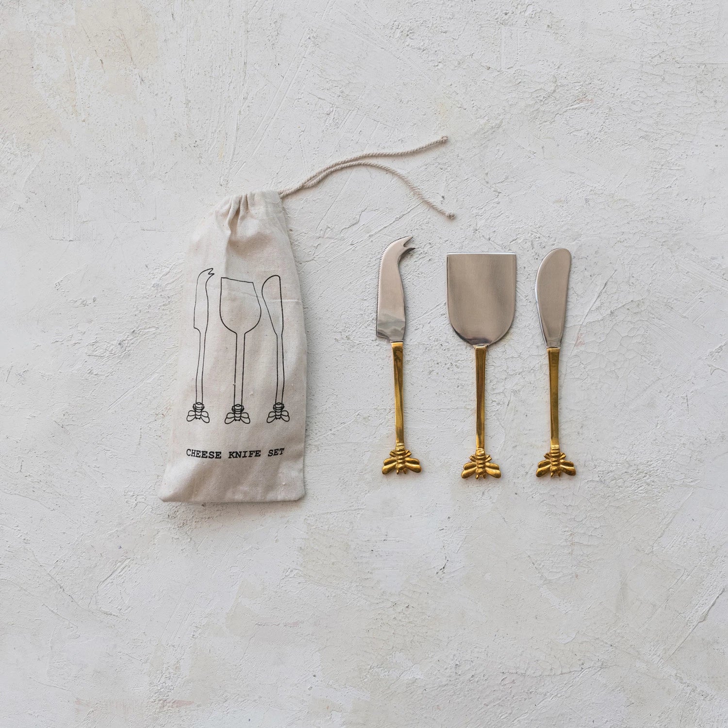 Slice into sophistication with these charming cheese knives featuring adorable bee-themed handles in a shimmering gold finish. Each 6-1/2" stainless steel and brass blade glides effortlessly through soft cheeses, hard varieties, and everything in between. This delightful set of three arrives in a printed drawstring bag, making it the perfect hostess gift that'll have guests buzzing with delight—or treat yourself to a touch of whimsy at your next charcuterie board gathering.
