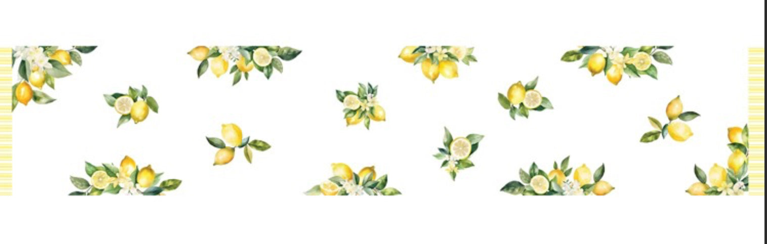 Brighten your table with this delightful reversible Lemon Grove Table Runner! Crafted from 100% cotton, one side features a cheerful lemon print that brings sunshine to your dining space, while the flip side showcases a crisp yellow and white stripe for versatile styling. At 14 x 72 inches, it's the perfect length for standard tables. Mix and match looks depending on your mood or season—double the design, double the fun!