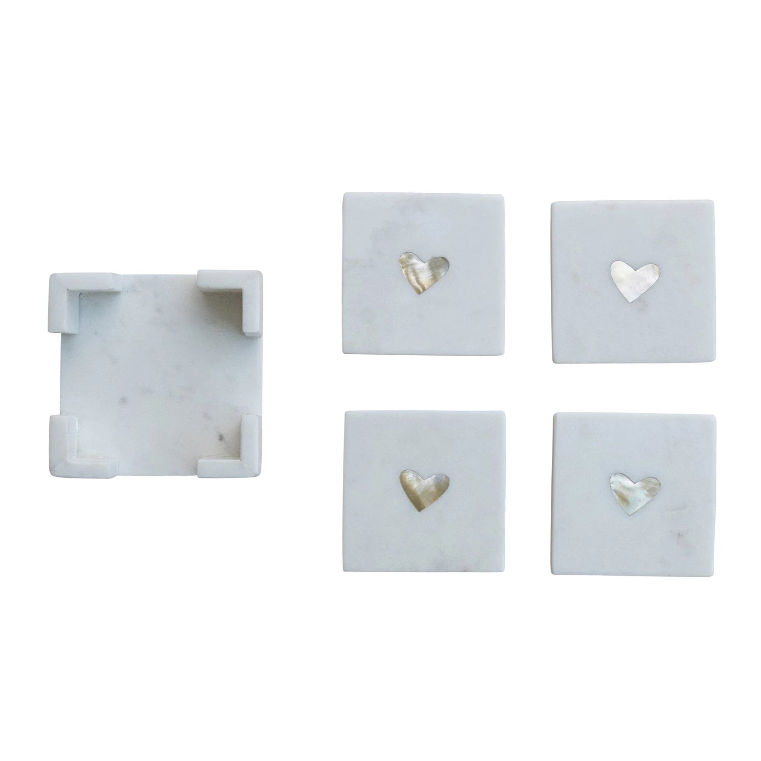Protect your tables in style with these gorgeous marble coasters! Each 4" square coaster features an elegant heart-shaped mother of pearl inlay that catches the light beautifully. The natural white and cream tones complement any décor, while the included holder keeps them organized and ready to impress. Perfect for sipping your favorite beverage without worry—or wrap them up as a gift that says "I love your home as much as you do." A little luxury that actually gets used!