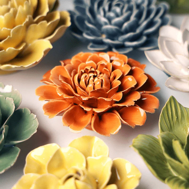 Add a burst of cheerful color to your space with the Orange Fiesta Marigold Wall Flower! This handmade ceramic flower shines in a delightful shade of orange and measures 4.5 inches across and 1.75 inches tall. Its keyhole makes hanging a breeze, turning your walls into a playful garden of unique, bright decor.